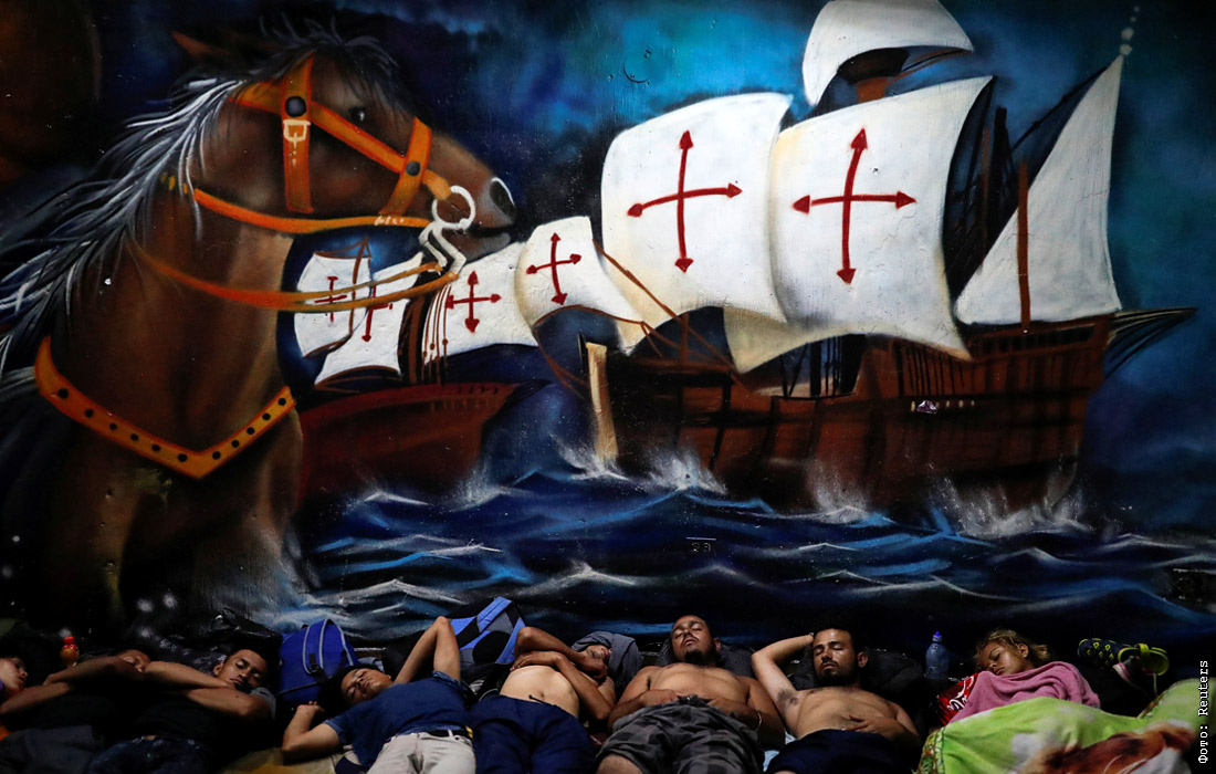 Мигранты из Гондураса отдыхают на площади города Текун-Уман у границы Гватемалы и Мексики, ожидая появления новых участников каравана. Президент США Дональд Трамп пригрозил, что может направить войска для ужесточения контроля на американско-мексиканской границе.