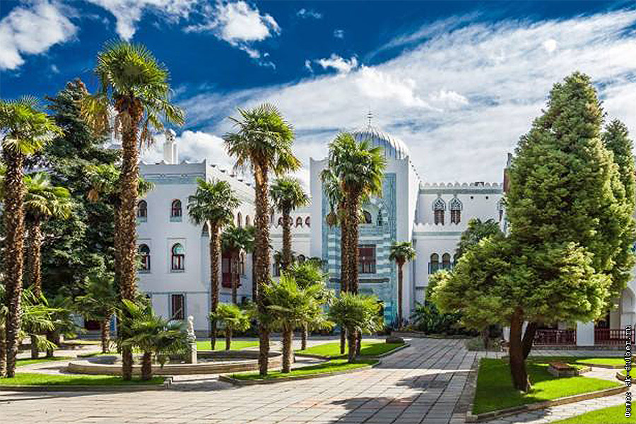 Санаторий, исполненный в духе древних храмовых построек Каира, встречает гостей приветствием "Да благословит Аллах вошедшего сюда", высеченным над главным входом на арабском языке