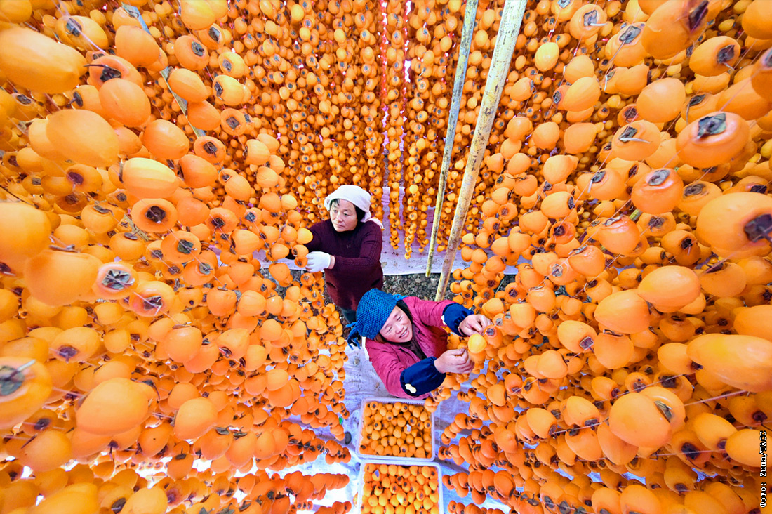 Фермеры сушат хурму в китайской деревушке провинции Шаньдун