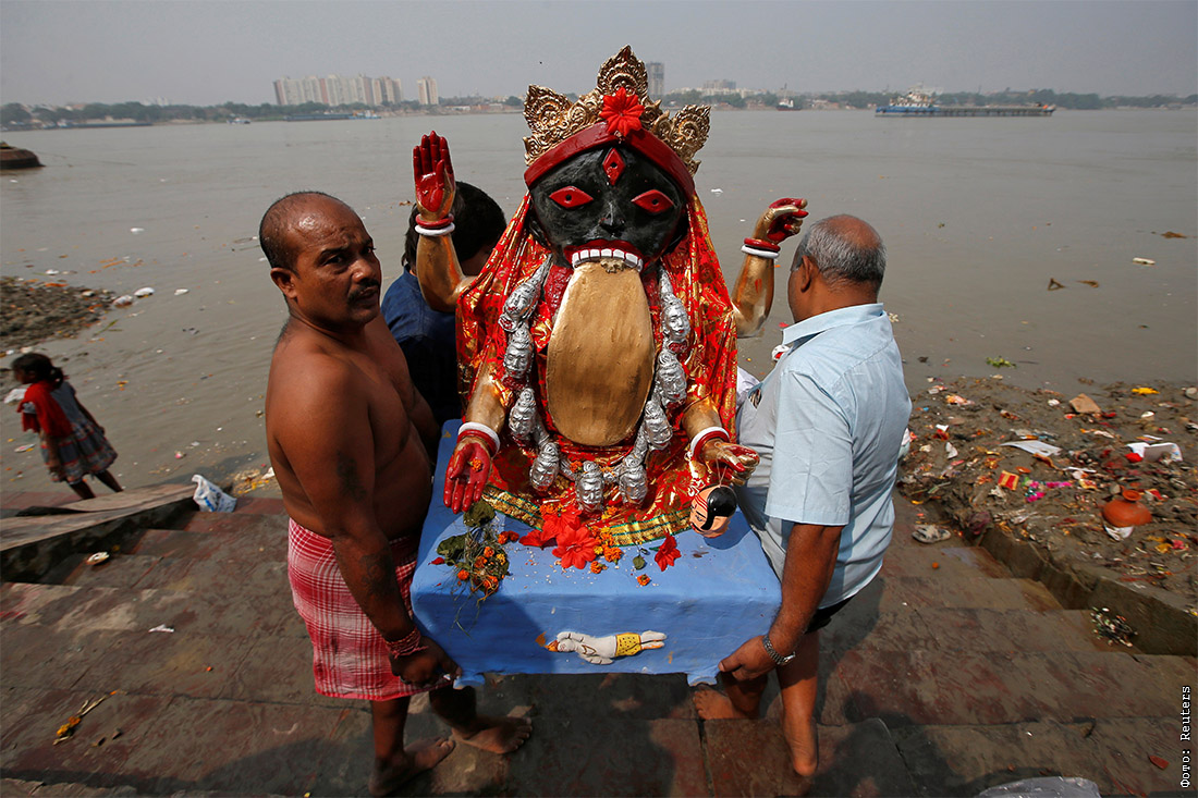 Пока Нью-Дели задыхается от смога, жители Калькутты отправляют статуи Кали поплавать по Гангу, готовясь таким образом к грядущему фестивалю Кали-пуджа