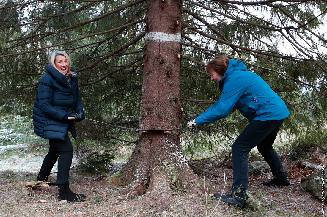 Мэр Осло Марианна Борген (справа) и Линдси Холл из Вестминстерского городского совета пилят 80-летнюю ель для Трафальгарской площади в Лондоне