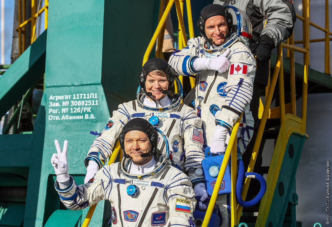 Члены экипажа экспедиции МКС-58/59 космонавт Роскосмоса Олег Кононенко, астронавт NASA Энн Макклейн и астронавт Канадского космического агентства Давид Сен-Жак (слева направо) перед запуском ракеты-носителя "Союз-ФГ" с кораблем "Союз МС-11" с "Гагаринского старта" космодрома Байконур