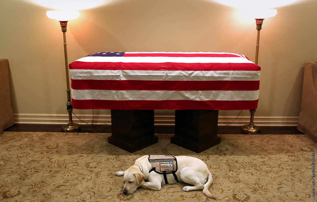 Служебная собака Джорджа Буша Салли, сопровождавшая экс-президента в последние месяцы его жизни, охраняет гроб с телом своего хозяина в Хьюстоне