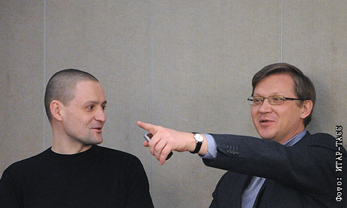 Координатор движения "Левый фронт" Сергей Удальцов и председатель общественного движения "Выбор России" Владимир Рыжков (слева направо) на дополнительном пленарном заседании Государственной Думы РФ.