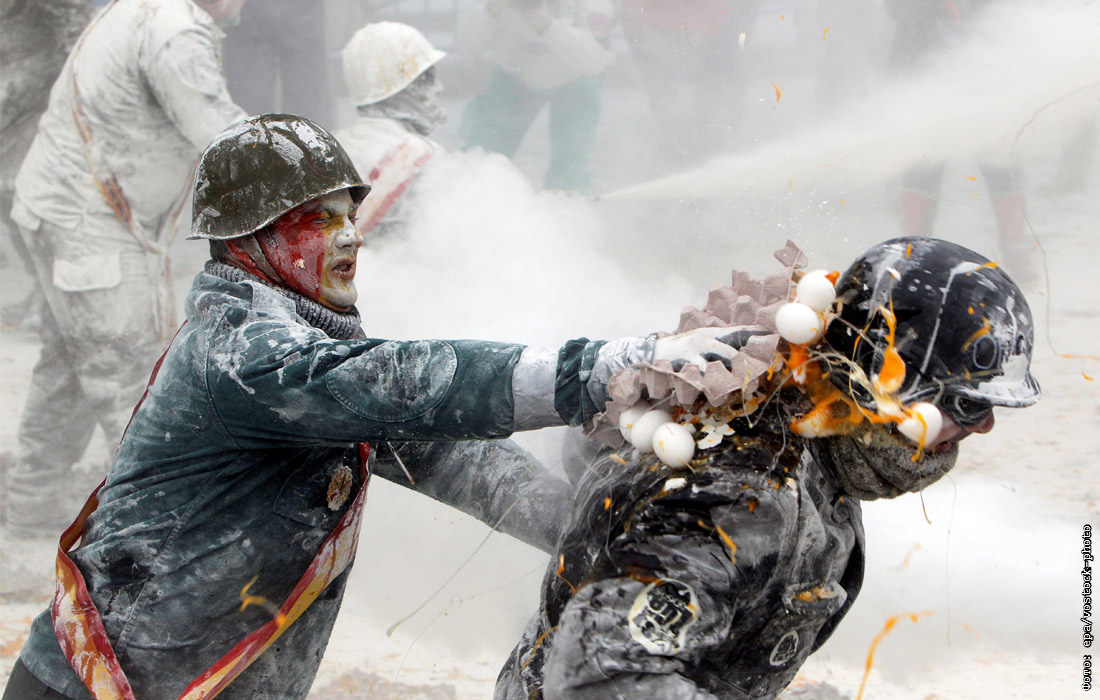 В испанском городе Иби в рамках фестиваля Эльс Энфаринатс прошла ежегодная мучная битва. На главной площади города жители, одетые в старинную военную форму, забрасывали друг друга мукой и сырыми яйцами.