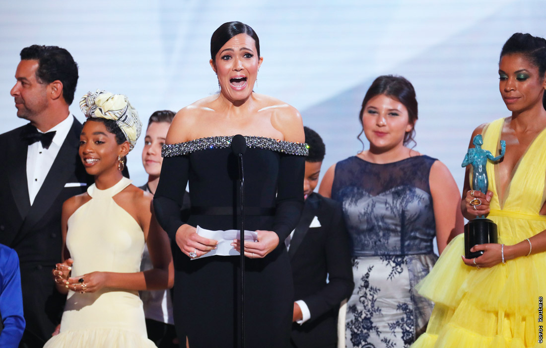 Актриса Мэнди Мур во время вручения премии за лучший актерский ансамбль в драматическом сериале, которую получила команда сериала "Это мы"
