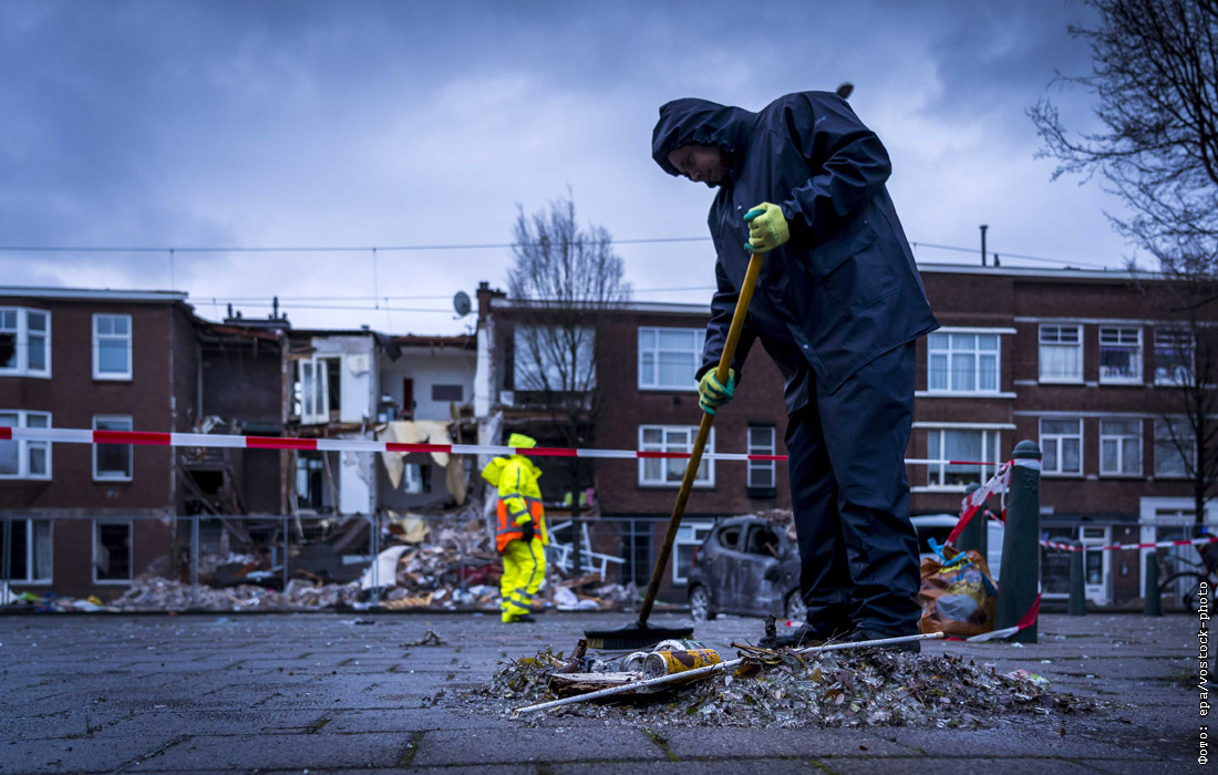 В Гааге коммунальные службы убирают осколки стекол на месте взрыва бытового газа в трехэтажном жилом доме. В результате происшествия обрушились фасады нескольких домов, были повреждены припаркованные рядом с местом взрыва автомобили. Пострадали как минимум девять человек, семь из которых были госпитализированы.