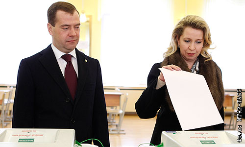 Действующий президент РФ Дмитрий Медведев с супругой Светланой голосуют в столице