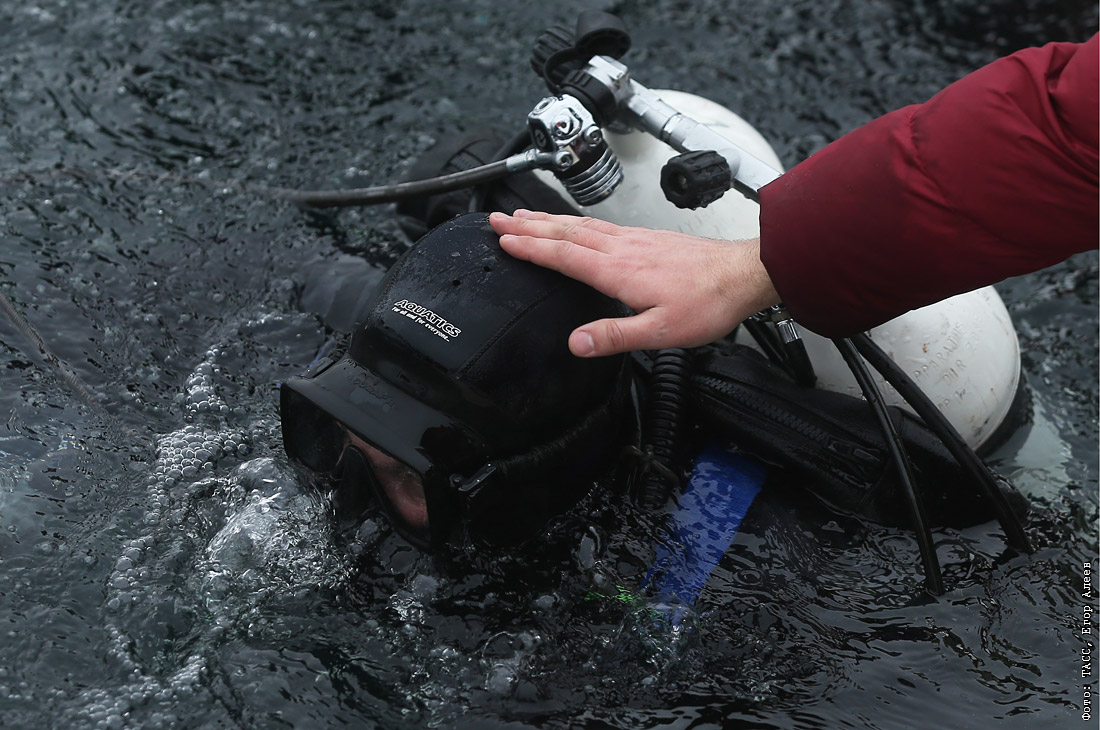 Аквалангист подводного научно-исследовательского отряда РГО им. А.Леонова на озере Изумрудное во время установления мирового рекорда по длительности погружения под лед на 10 часов
