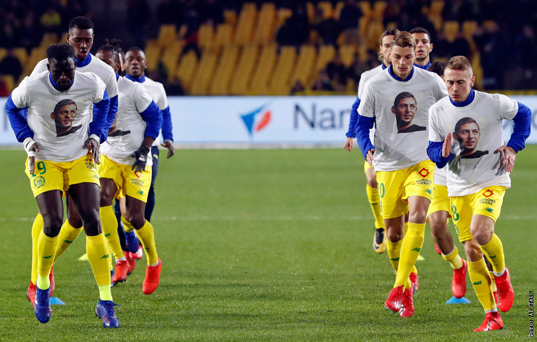 Игроки "Нанта" надели футболки с изображением своего бывшего партнера по команде Эмилиано Салы во время тренировки перед матчем против "Сент-Этьена". Аргентинский футболист пропал без вести 21 января после крушения самолета над Ла-Маншем. В середине января 28-летний аргентинец подписал контракт о переходе из французского футбольного клуба "Нант" в "Кардифф Сити" (Уэльс).