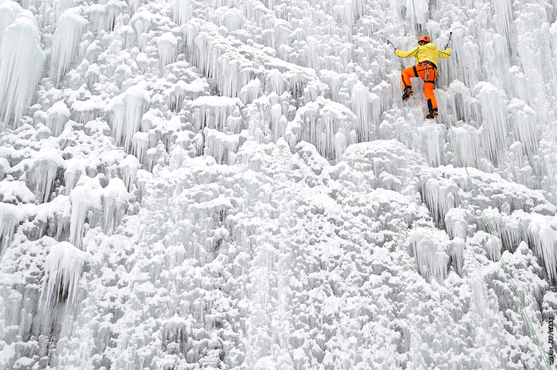 Мужчина поднимается по искусственной ледяной стене, расположенной во дворе города Либерец, Чешская Республика, в воскресенье, 27 января 2019 года.