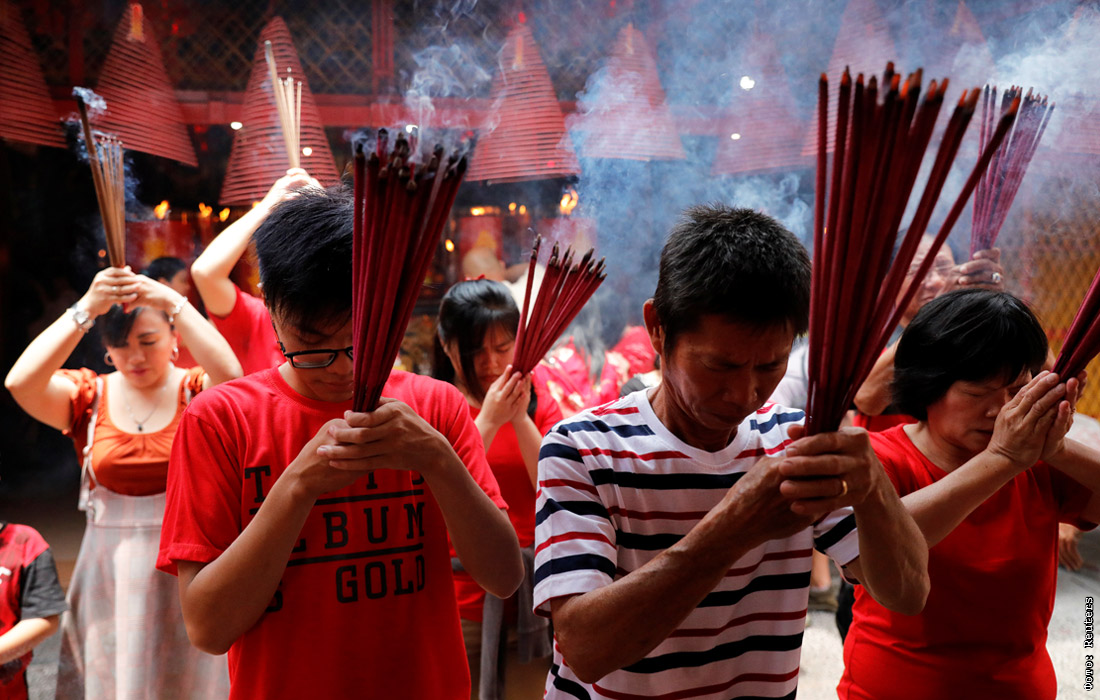 Верующие зажигают ароматические палочки во время молитвы в храме в Джакарте, Индонезия