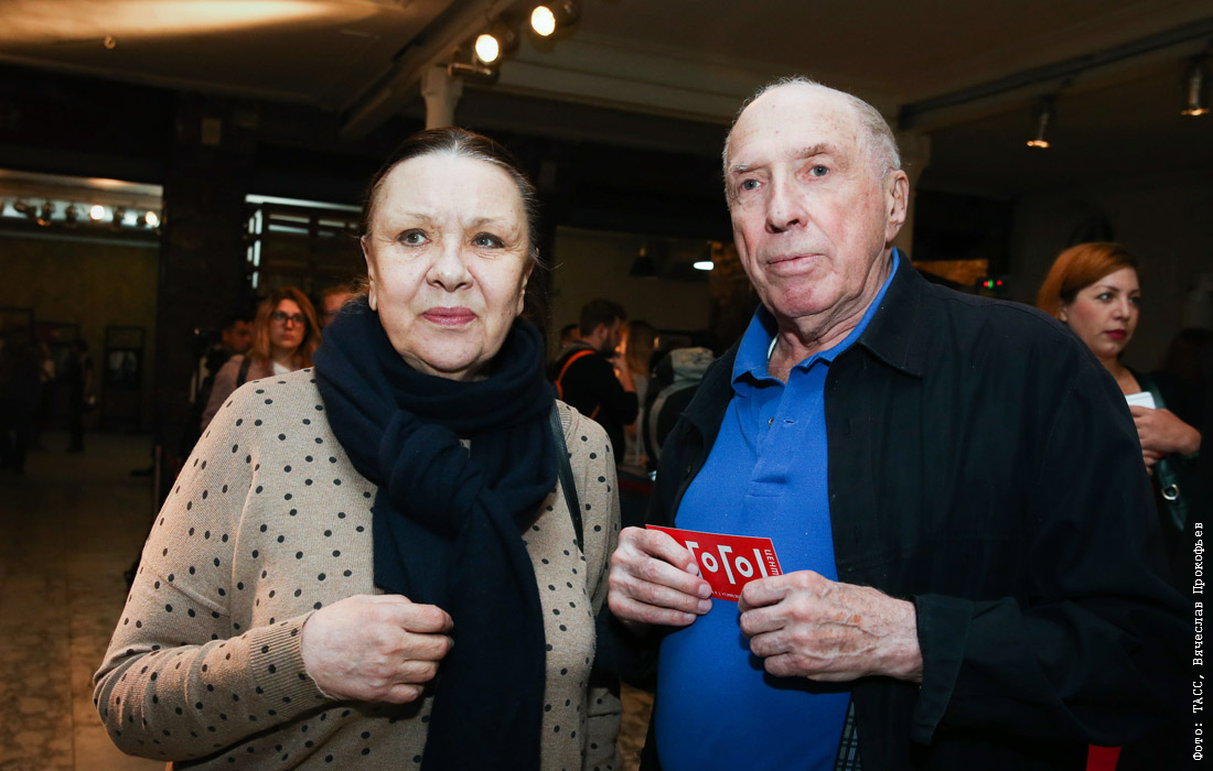 Сергей Юрский с супругой Натальей Теняковой на премьере фильма "Ученик" режиссера Кирилла Серебренникова в театре "Гоголь-центр" в Москве. 2016 год.