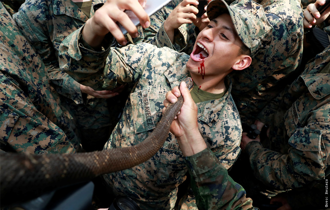 На тайской военно-морской базе в провинции Чонбури прошла тренировка по выживанию в джунглях, которая проводится в рамках ежегодных совместных учений США и стран Азии Cobra Gold. Одним из навыков в программе учебного курса является умение охотиться на змей и пить змеиную кровь.