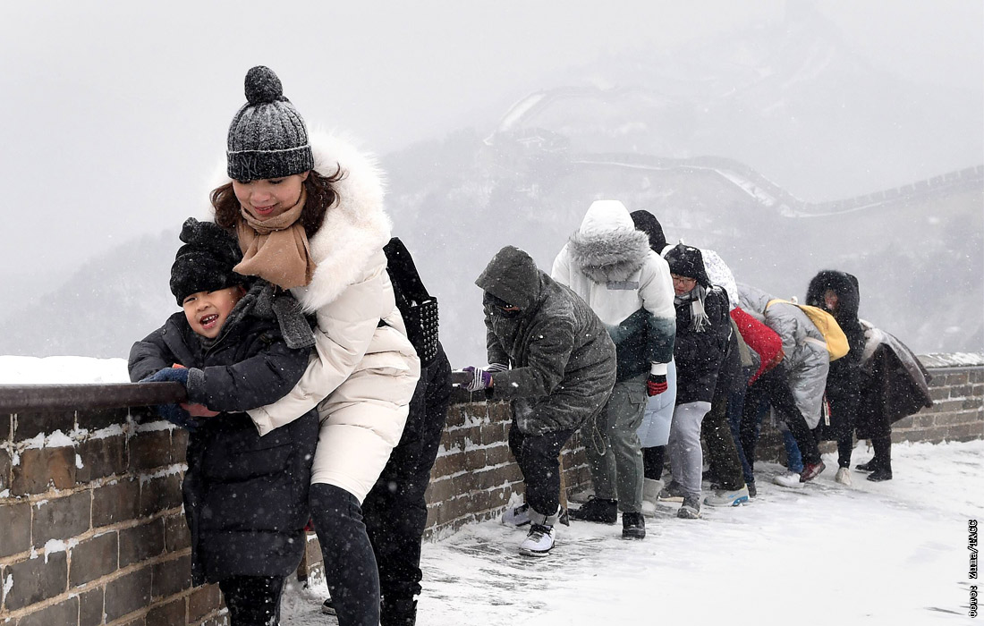 Великая китайская стена покрылась снегом. На дорожках достопримечательности образовался слой льда, затрудняющий перемещение туристов.