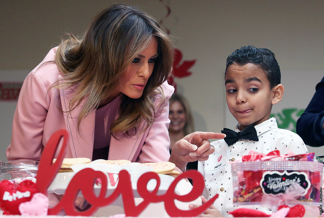 Первая леди США Мелания Трамп с пациентом детского отделения Национального института здоровья в Бетесде в День святого Валентина. Штат Мэриленд, США.
