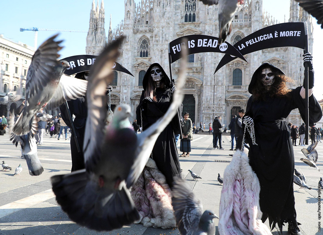 Акция движения PETA против использования меха животных на площади Дуомо перед началом Недели моды в Милане