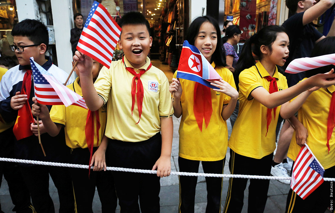 На улице политиков ждали десятки школьников, размахивающие флажками Северной Кореи и США