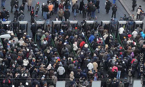Участники акции оппозиции "За честные выборы" проходят через рамки металлоискателей на Пушкинской площади.