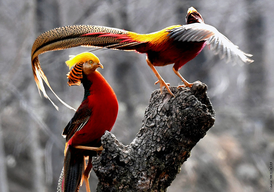 Золотые фазаны в лесу в китайской провинции Хэнань