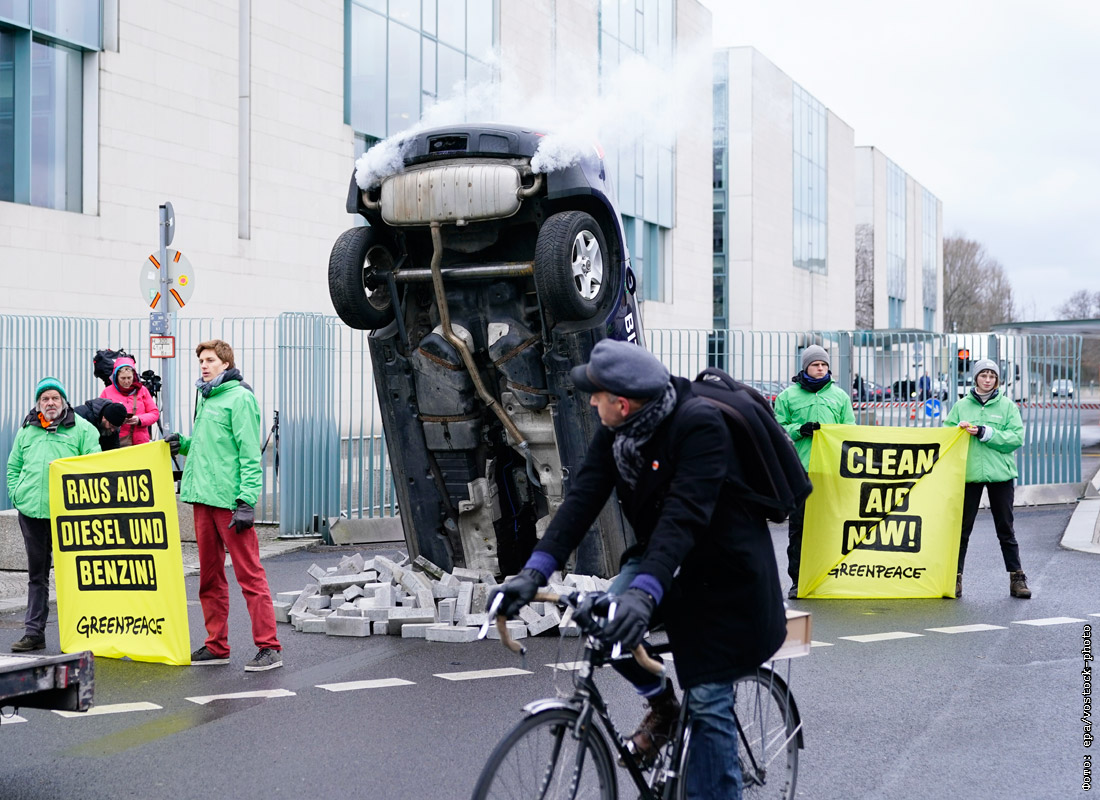 Протест Гринпис перед зданием канцелярии в Берлине, где обсуждается проблема выбросов выхлопных газов