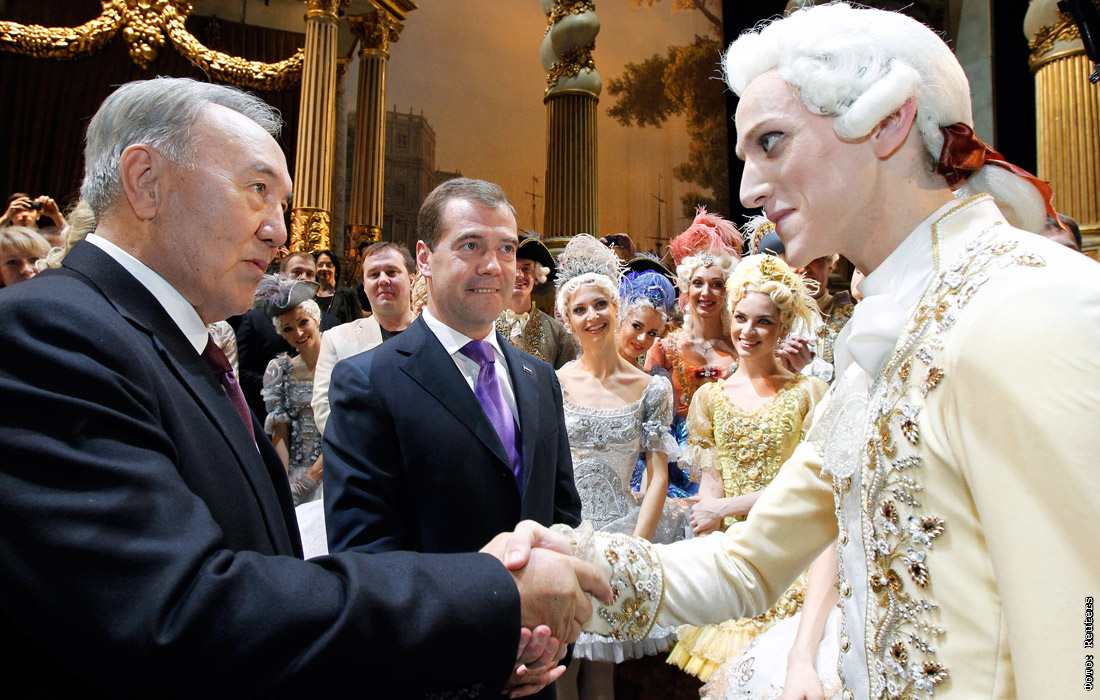 Нурсултан Назарбаев и Дмитрий Медведев приветствуют артистов Большого театра. 2011 год.