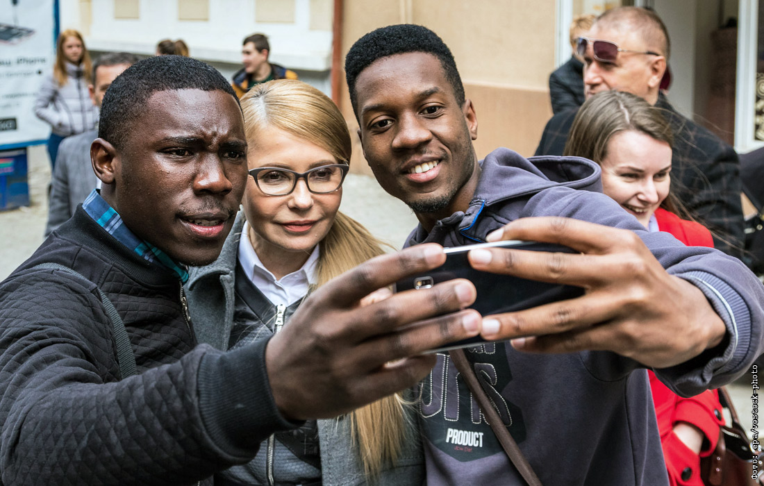 Кандидат в президенты Украины, бывший премьер-министр страны Юлия Тимошенко фотографируется с иностранными студентами во время встречи с избирателями в Ужгороде