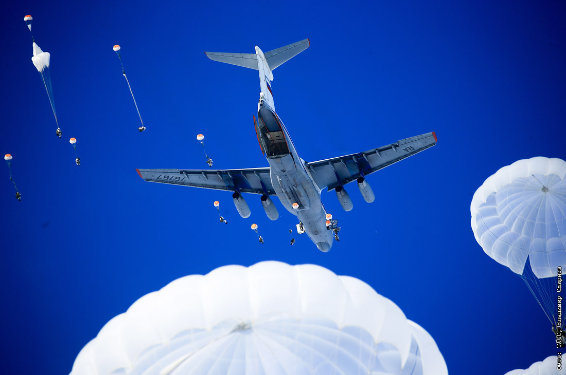 Военнослужащие Воздушно-десантных войск РФ во время десантирования из самолета Ил-76 на площадку приземления около деревни Будихино в рамках учений 98-й гвардейской воздушно-десантной дивизии