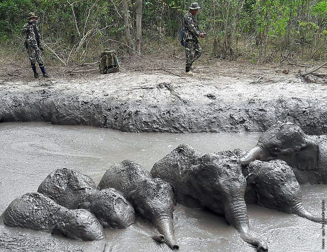 Шестеро детенышей диких слонов были спасены из грязного пруда в национальном парке на северо-востоке Таиланда