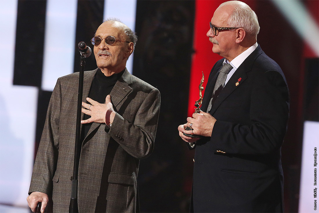 На фото: режиссеры Никита Михалков и Георгий Данелия (справа налево), получивший специальную премию "Золотой Орел" "За неувядаемый талант, за мужество", во время 12-й церемонии награждения на "Мосфильме". 2014 год.
