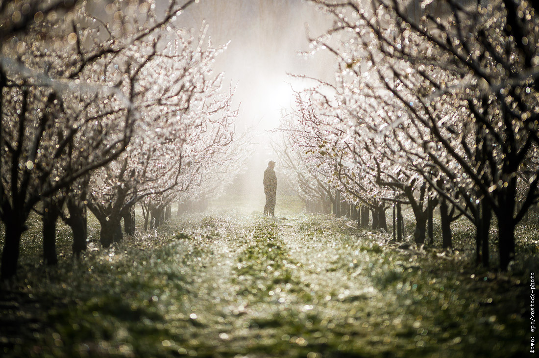 Зацветающие абрикосовые деревья, покрытые тонким слоем льда для защиты от заморозков в саду в Саксонии
