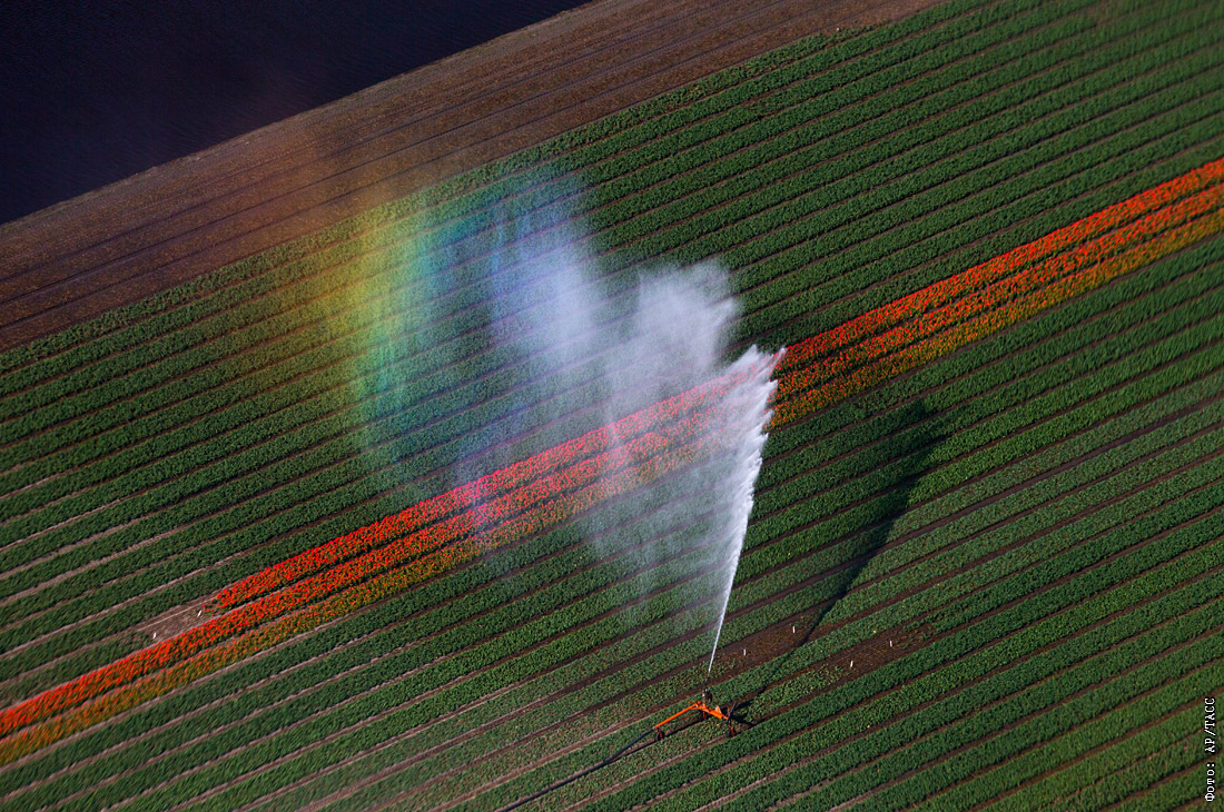 Полив цветущих полей в нидерландском Лиссе