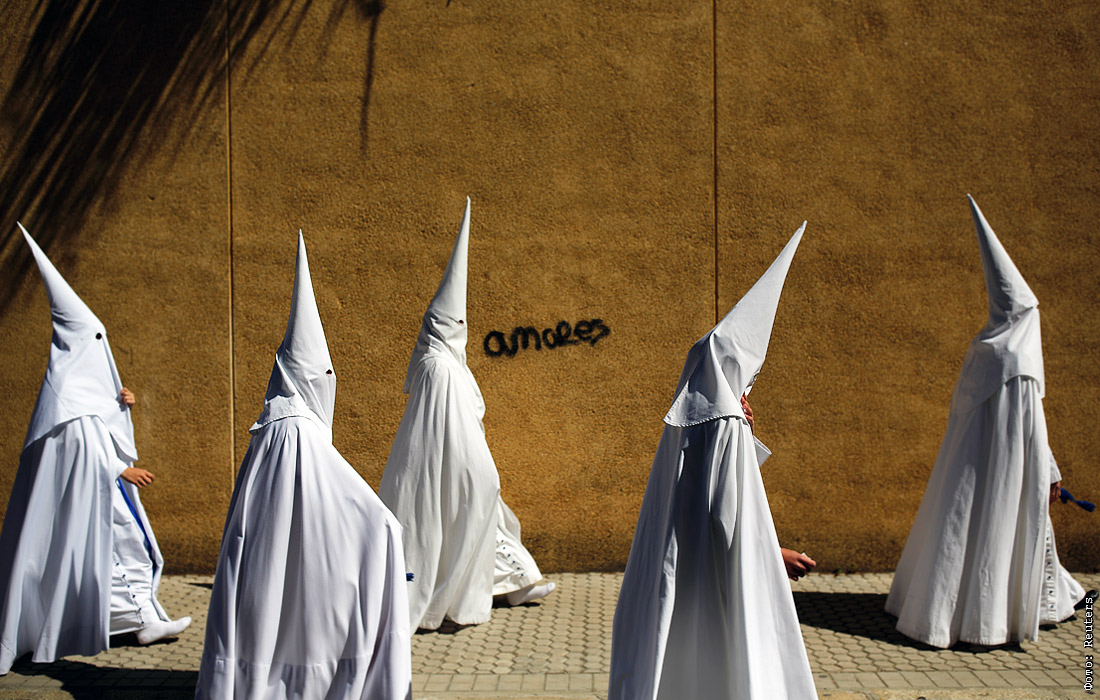 Кающиеся грешники из братства La Paz принимают участие в религиозном шествии в Севилье, Испания