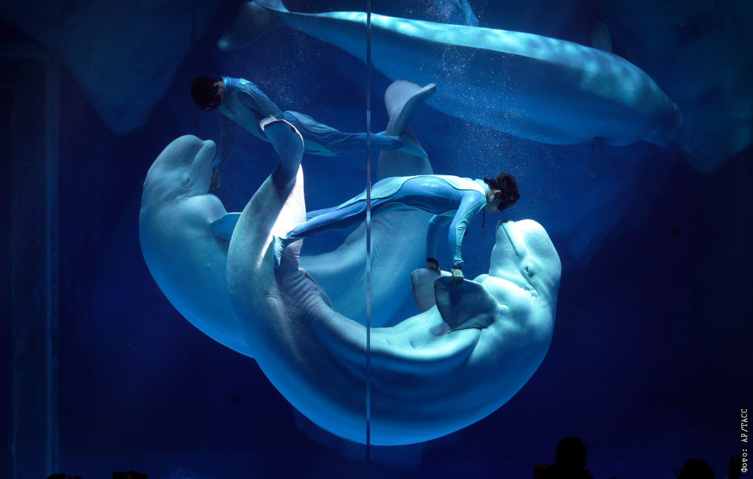 Танец белых китов в океанариуме Шанхая