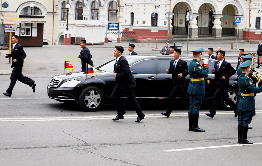 На привокзальную площадь подали лимузин, который заранее доставили во Владивосток. Ким Чен Ын сел в него и уехал, окруженный сотрудниками охраны, бегущими рядом с автомобилем.