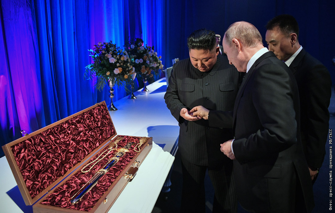 Путин подарил лидеру КНДР дорожный чайный сервиз и саблю, а Ким Чен Ын в ответ президенту РФ подарил меч. Согласно традиции при получении в подарок оружия лидеры обменялись и монетками.