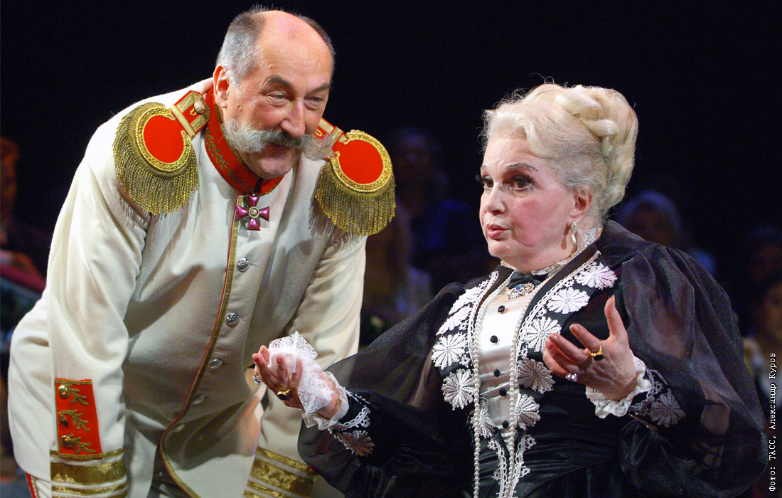 Актеры Борис Клюев и Элина Быстрицкая во время празднования 250-летнего юбилея Малого театра в Москве. 2006 год.