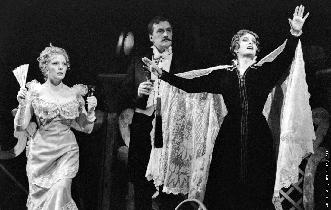 Народная артистка РСФСР Лилия Юдина, артист Борис Клюев и народная артистка СССР Элина Быстрицкая (слева направо) в сцене из спектакля "Без вины виноватые". 1981 год.