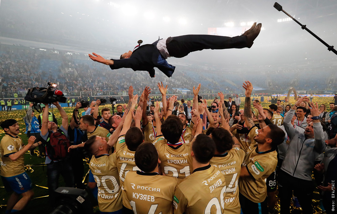 Игроки "Зенита" качают главного тренера Сергея Семака во время церемонии награждения после окончания матча чемпионата России по футболу с ЦСКА
