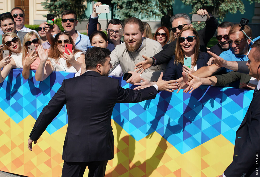 Владимир Зеленский приветствует своих сторонников у Мариинского дворца перед началом церемонии инаугурации