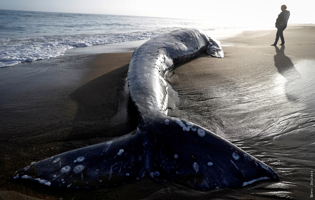 Огромный серый кит выбросился на один из пляжей Калифорнии