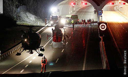 По предварительным данным, автобус, перевозивший 52 человека, врезался в стену тоннеля. 24 ребенка получили ранения. Пассажиры автобуса, зарегистрированного в Бельгии, возвращались домой с горнолыжных курортов.