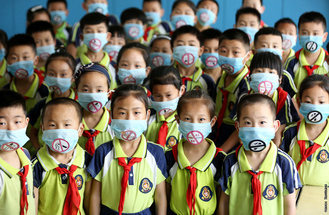 Ученики начальных классов школы в китайской провинции Шаньдун во время мероприятия, посвященного Всемирному дню без табака