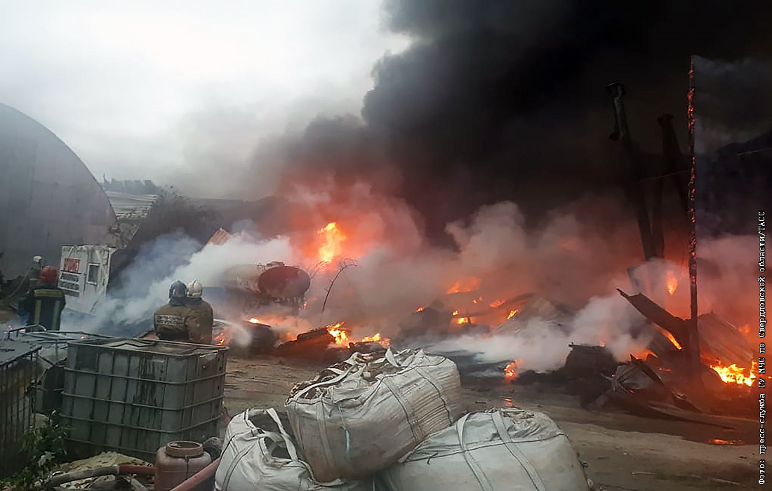 Тушение пожара площадью 2 тыс. кв. метров на территории складских помещений с лакокрасочной продукцией в городе Арамиле Свердловской области