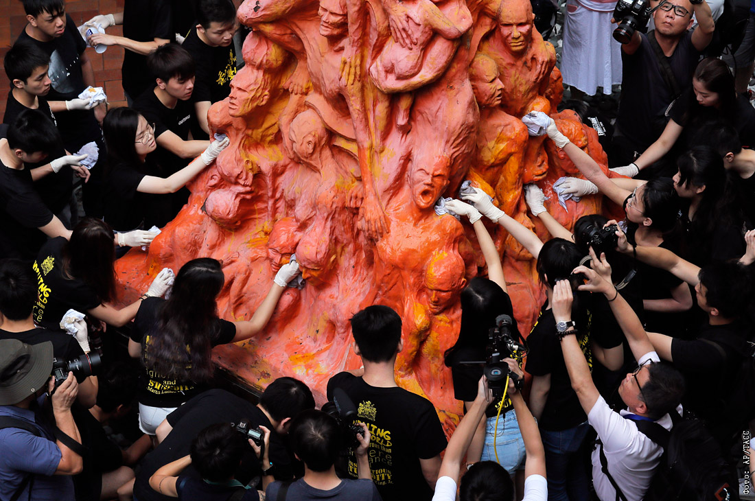 Очистка скульптуры, посвященной событиям на площади Тяньаньмэнь 1989 года, в Гонгконгском университете
