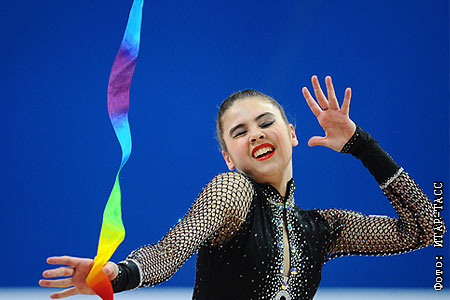 Российская спортсменка Александра Меркулова во время выступления с лентой в финале международного турнира по художественной гимнастике "Гран-При Москва-2011" в УЗС "Дружба