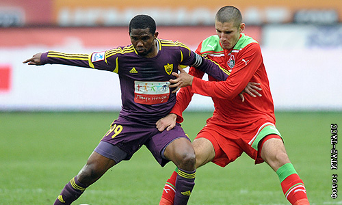 Игроки "Анжи" Самуэль Это'О и "Локомотива" Тарас Бурлак (слева направо) в матче чемпионата России по футболу: "Локомотив" (Москва) - "Анжи" (Махачкала).