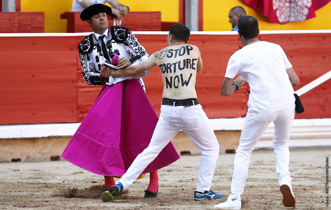 Каждый год во время фестиваля зоозащитники устраивают акции протеста против издевательства над быками и убийства животных во время боев