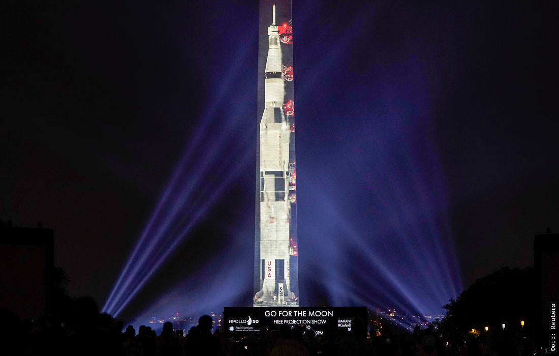 В столице США на Монументе Джорджа Вашингтона появилось изображение ракеты-носителя Сатурн V в натуральную величину. Проекция посвящена 50-й годовщине первой высадки человека на Луну.