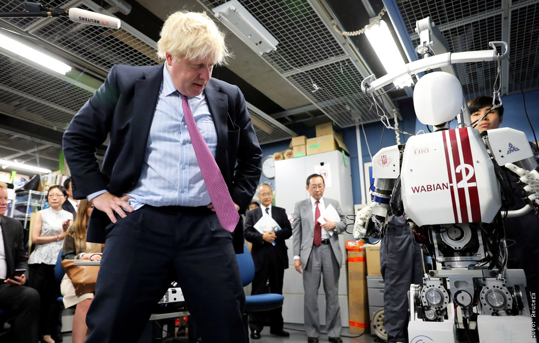 Борис Джонсон и двуногий гуманоидный робот Wabian2 в кампусе университета Васэда в Токио, Япония. Июль 2017 года.